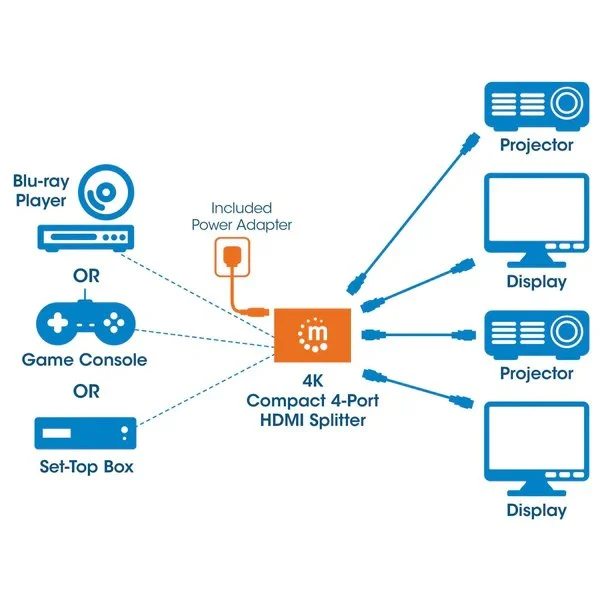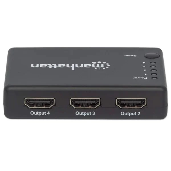 - Replicates an Ultra-High-Definition (UHD) digital audio/video signal for up to four UHD HDMI displays