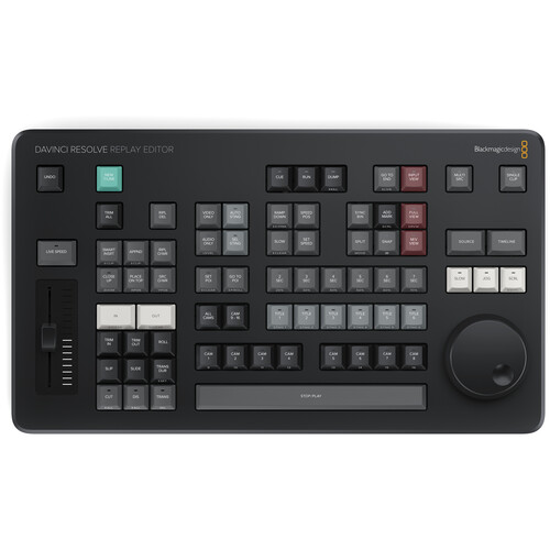 The Blackmagic Design DaVinci Resolve Replay Editor combines features for both replay and multicam editing in a single hardware control panel for live sports and news-cutting applications. Multiple keys toggle between inputs, set Point-of-Interests, and enable an auto stinger, among other functions. The panel connects to your preexisting network via Bluetooth 5.1 LE technology. A large internal battery keeps the panel going for long production days and can be turned on and off with an onboard switch. Charge the battery or use a separately available power supply via the USB-C port.
