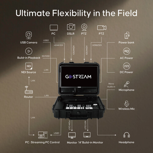 - GoStream Duet, 14″ Monitor, Hard Case